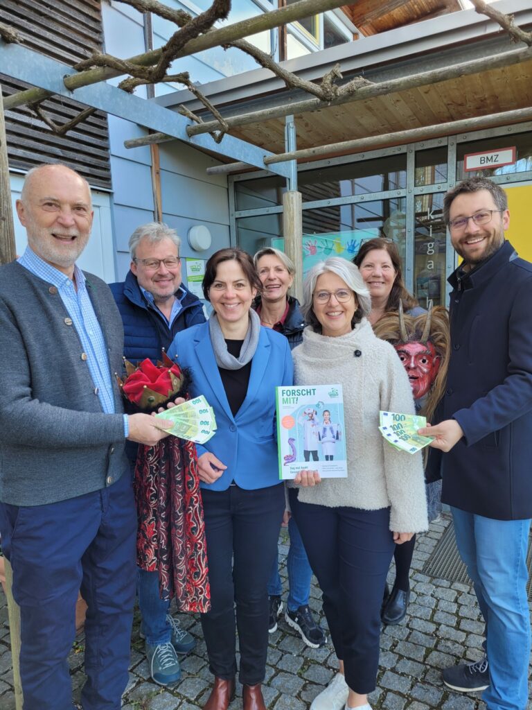 Die offizielle Übergabe der 800 Euro fand vor dem Kindergarten Hollerbusch in Holzkirchen statt, einer von der Stiftung ausgezeichneten Einrichtung. Anwesend waren ein Königsdarsteller und ein Perchtendarsteller (Peter und Simon Franz), die Projektleitung der Stiftung Kinder Forschen, Tamara Schär, und der KBW-Geschäftsführer Wolfgang Foit. Ebenfalls dabei waren die Kita-Leitungen Ursula Stacheter und Andrea Wahnschaffe.