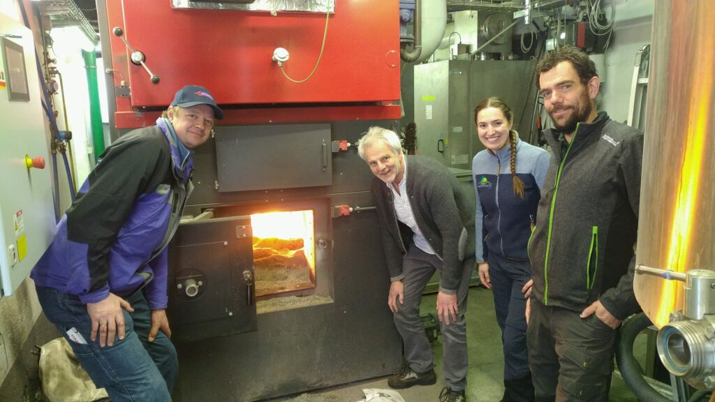 Foto (v.l.): Betreiber Josef Strobl, Andreas Scharli (Energiewende Oberland), Maria Meixner (WBV Wolfratshausen), Förster Sebastian Schlenz